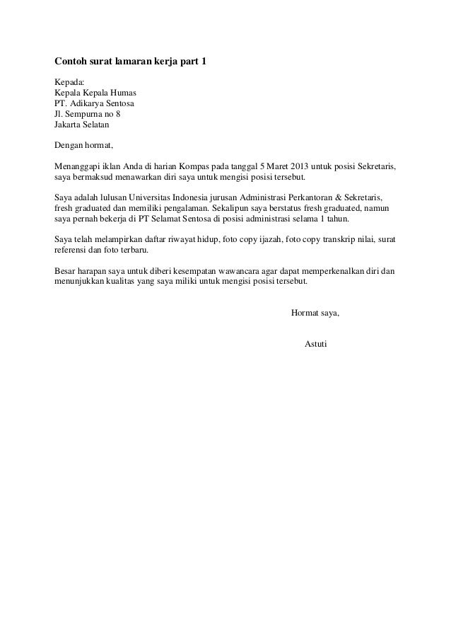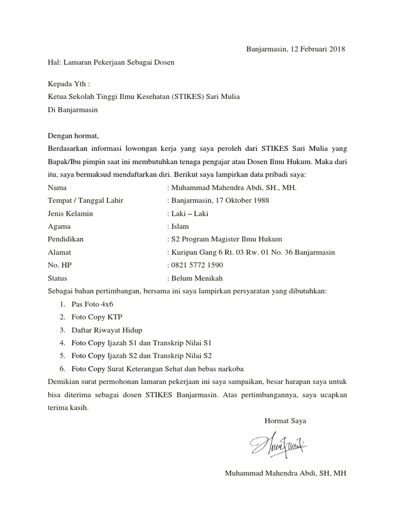 Surat Lamaran Kerja Simple Tulisan Surat Kerja