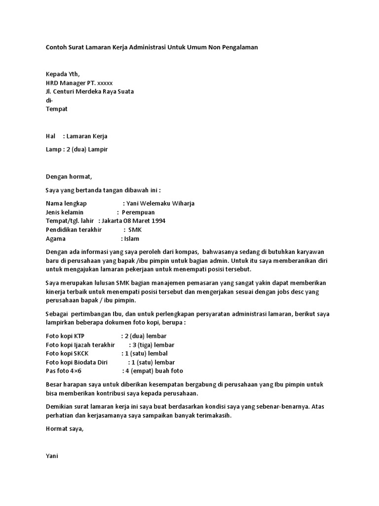 Contoh Surat Lamaran Kerja Administrasi Untuk Umum Non Pengalaman