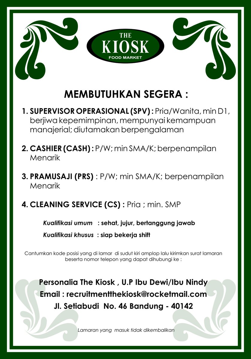 Lowongan Kerja Bdg On Twitter Loker Spv Cashier Pramusaji Cleaning Service Cv Personalia The Kiosk Jl Setiabudi No 46 Bandung 40142 Https T Co G9hhpshwdx